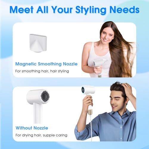 ✅【Safety & Automatic Cleaning Function】The blow dryer has ALCI safety plug to protect against overheating and electrical issues. This plasma hairdryer comes with double-layer magnetic suction nozzle that rotate 360° for prevent from burns. A 0.2mm filter mesh prevents hair from entering the motor, while the automatic cleaning function simplifies maintenance, effectively extending the lifespan of the hair blower. Press for 10 seconds to enter the cleaning mode. After 10 seconds of motor reversal, restore the motor to rotate