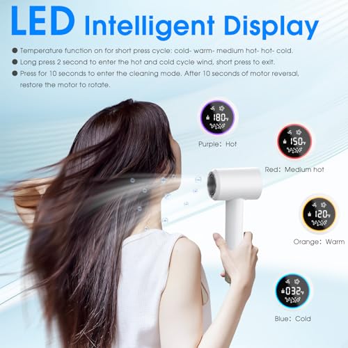 ✅【5 Heat & 2 speed Settings】This Plasma hair dryer features 2 speed settings (High Speed for rapid drying and Low Speed for gentle styling), ensuring versatility for any hair type. Professional high speed hair dryer allows you to customize your drying experience. Enjoy 5 temperature options: the Purple Light (180℉) for Hot Wind that speeds up drying, the Red Light (150℉) for Medium Hot Wind to reduce heat damage, the Yellow Light (120℉) for Warm Wind that nourishes your hair, the Blue Light (32℉) for Cold Wind to quickly shape your style, and a Slow Flash (0℉) setting for alternating Hot and Cold Wind to prevent overheating during blow drying and styling