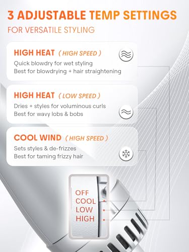 3X Faster Drying – 33000 RPM professional motor cuts styling time in half with 3 heat settings (330°F/300°F/265°F) for all hair types